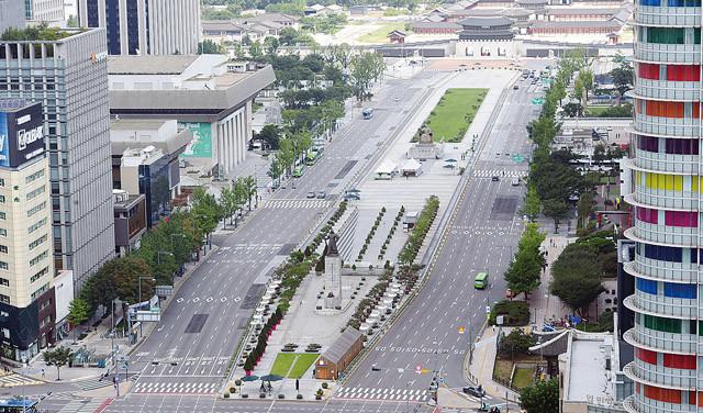 정부의 사회적 거리두기 2단계 발령된 23일 서울 광화문 일대 도로가 한산한 모습을 보이고 있다.