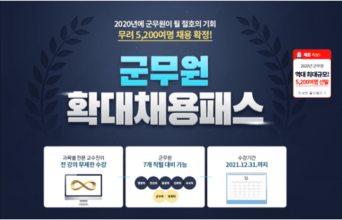 [시민일보 = 황혜빈 기자]종합교육기업 에듀윌(대표 박명규)은 군무원에 합격하기 위한 절호의 기회를 수험생들이 놓치지 않도록 ‘군무원 확대채용패스’를 오픈하고 수강생을 모집한다고 10일 밝혔다.