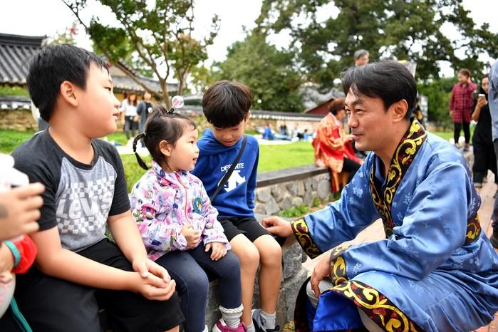 경기 하남시 시 승격 30주년을 맞이해 최근 하남전통예술단이 주최·주관하는 '2019 노거수 은행나무 축제'가 열렸다. 이날 행사에서는 전통예술단 한복 퍼레이드 등이 진행됐다. 사진은 행사에 참여한 김상호 시장(오른쪽)이 아이들과 인사하는 모습. (사진제공=하남시청)