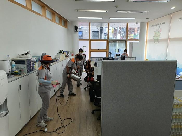 경기 광주의용소방대가 최근 코로나19 지역 확산방지를 위해 보훈회관 등 9개 보훈단체 사무실 등 방역취약 시설에 대한 긴급방역을 전개했다. 사진은 이날 대원들이 광주의용소방대 광주시 혁신교육협력지원센터에서 방역활동을 하고 있는 모습. (사진제공=광주시청)