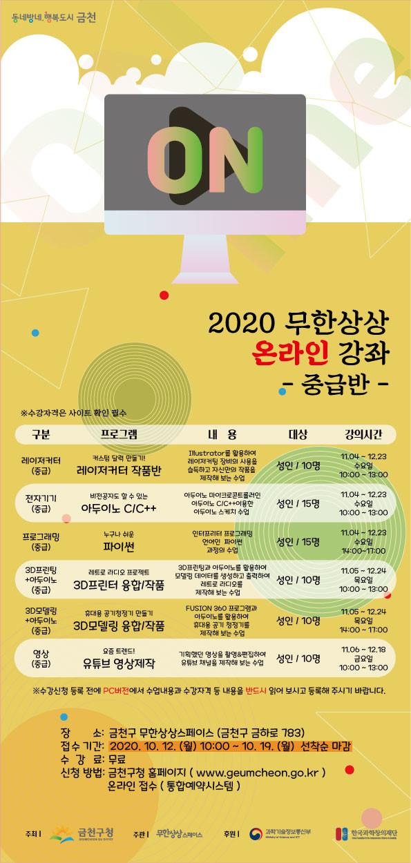 [시민일보 = 여영준 기자] 서울 금천구(구청장 유성훈)는 오는 11월4일~12월24일 무한상상 스페이스에서 새로운 패러다임의 비대면 ‘무한상상 온라인 강좌’ 프로그램을 운영한다고 밝혔다.
