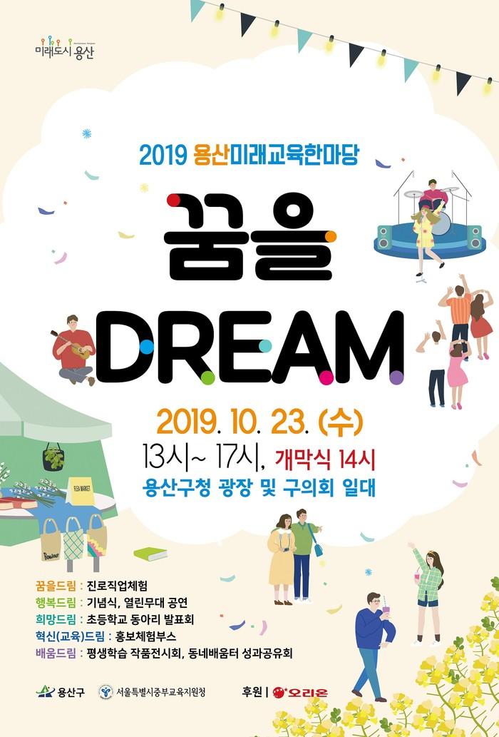 [시민일보 = 홍덕표 기자] 서울 용산구(구청장 성장현)가 오는 23일 구청 광장 및 용산아트홀에서 '2019 용산미래교육 한마당 꿈을 드림(DREAM)'을 개최한다.
