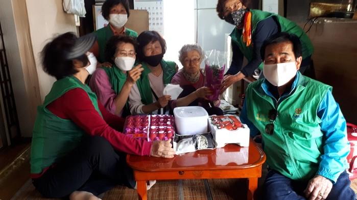 충남 아산시 송악면 자원봉사센터와 바르게살기운동협의회는 가정의 달을 맞아 한국부인회 아산지회, 교육공동협동조합노리아이와 함께 홀몸노인 가구 등을 대상으로 주 1회씩 총 4회 반찬나눔 봉사를 하고 있다. 사진은 봉사자들이 홀몸노인에 반찬 전달 후 기념촬영을 하는 모습. (사진제공=아산시청)