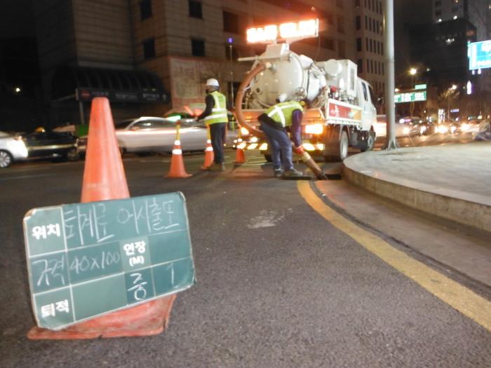 | ▲ 퇴계로 빗물받이 준설작업이 진행되고 있다. (사진제공=중구청) |