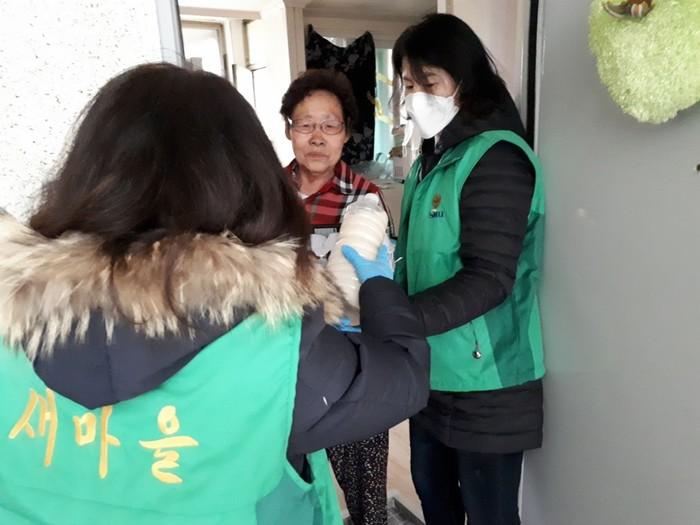 인천 계양구 계양2동 새마을부녀회는 코로나19 확산이 장기화됨에 따라 지난10일 생활이 어려운 저소득 취약계층의 안부를 확인하기 위해 사골곰탕, 계란 등의 음식과 함께 가정방문을 했다. 사진은 부녀회원들이 노인에게 음식을 전달하는 모습. (사진제공=계양구청)