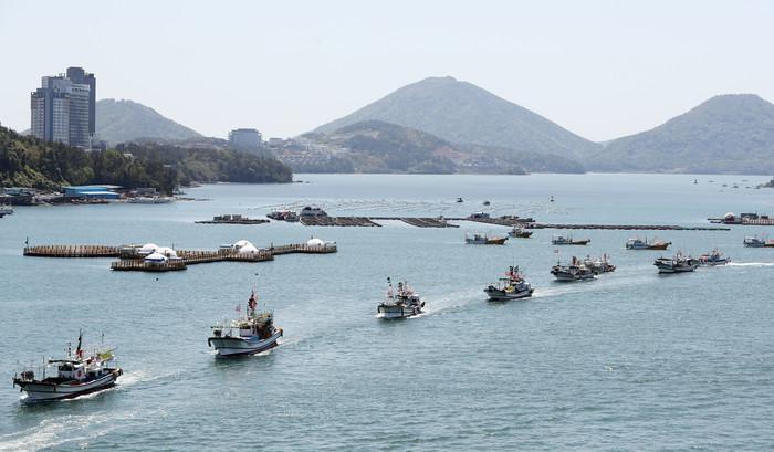 19일 오전 전남 여수시 국동항에서 어민들이 일본 원전 오염수 해양방출 결정을 규탄하며 해상 퍼레이드를 펼치고 있다. 이날 해상 퍼레이드에는 여수지역 어선 150여척이 참가했다.