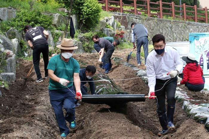 인천 동구 송현3동행정복지센터와 통장자율회는 최근 유휴 토지에 텃밭을 조성하고 고구마 등을 재배해 홀몸노인 등 결식우려 취약계층 가구에 전달하기 위한 ‘동구 행복나눔텃밭’을 조성했다. 사진은 이날 허인환 구청장(오른쪽)이 봉사자들과 함께 텃밭을 조성하고 있는 모습. (사진제공=동구청)