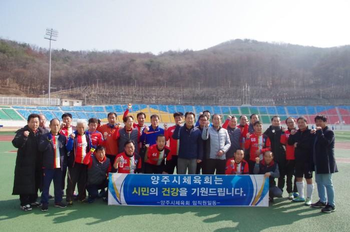 경기 양주시체육회는 코로나19(우한폐렴)로 인한 각종 대회 연기, 체육활동 저조 등의 위축된 분위기를 전환하기 위해 노인종목 체육단체를 찾아가 마스크와 식수를 전달했다. 사진은 체육회 관계자들이 60·70대 축구연습장을 방문해 마스크 및 식수를 전달한 후 기념촬영을 하는 모습. (사진제공=양주시청)