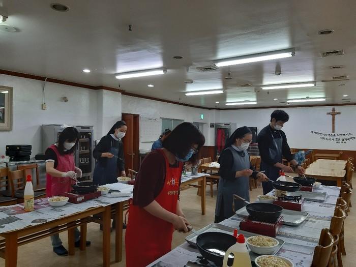 인천 부평구 부평1동 성당은 최근 청천2동내 거동 불편 저소득층 홀몸노인 10명을 대상으로 직접 조리한 반찬을 점심시간에 맞춰 각 집에 전달하는 ‘찾아가는 어르신 반찬나눔’ 봉사를 시작했다. 사진은 전달할 반찬을 만들고 있는 모습. (사진제공=부평구청)