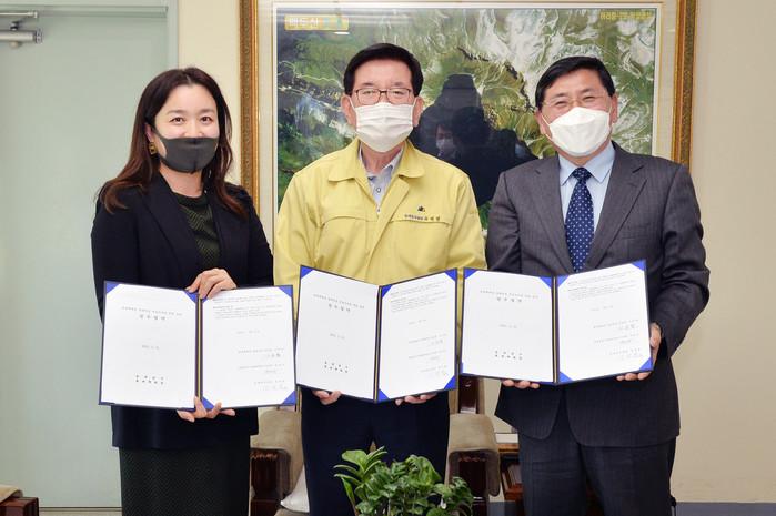 | ▲ 유덕열 구청장(가운데)과 이주현 롯데백화점 청량리점 지점장(왼쪽) 및 박희수 동대문구시설관리공단 이사장(오른쪽)이 부설주차장 개방 협약을 마친 후 기념촬영을 하고 있다. (사진제공=동대문구청) |