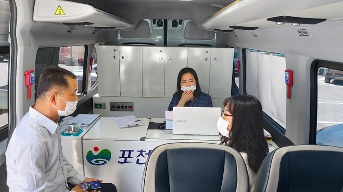 경기 포천시가 오는 12월까지 직업상담사가 현장을 직접 찾아가 구직자의 일자리 상담·상설면접·방문면접 등을 제공하는 ‘생생출동!’ 일자리 상담 차량을 운영한다. 사진은 최근 한 주민이 상담 차량에서 일자리 상담을 하고 있는 모습. (사진제공=포천시청)