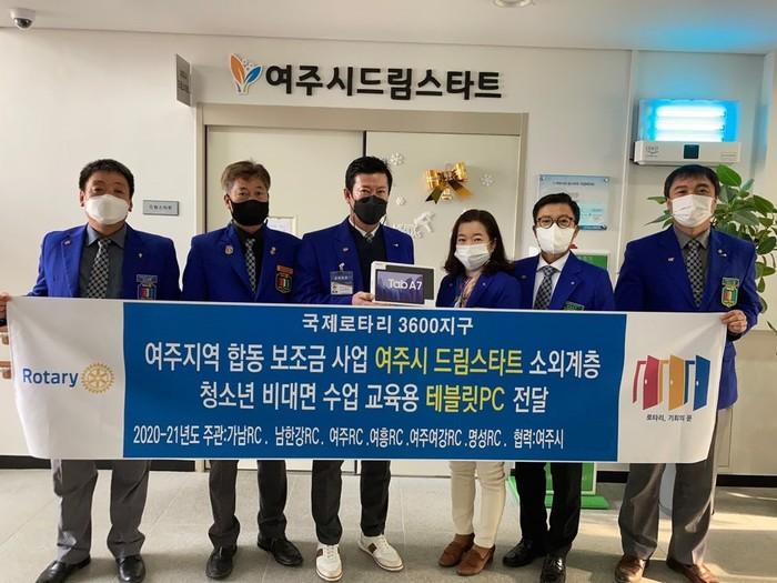 경기 여주시 드림스타트가 28일 지역 로터리클럽 합동보조금 사업인 '취약계층 아동 학습권 보장을 위한 태블릿 지원 사업'에 선정돼 700만원 상당의 태블릿 PC 22대를 후원받았다. 사진은 관계자들이 기념촬영을 하는 모습. (사진제공=여주시청)