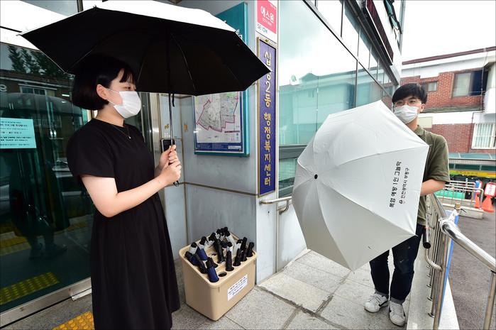 인천 부평구가 오는 9월11일까지 22개동 행정복지센터에서 구민 누구나 자유롭게 사용하고 반납할 수 있는 양심 '1인 그날막' 대여 서비스를 운영한다. 1인 그늘막은 폭염 대비뿐만 아니라 갑자기 내리는 비에도 대비할 수 있도록 사용 가능한 암막 우산으로 각 동마다 300~350여개가 비치됐다. 사진은 우산을 점검하고 있는 십정2동 직원들의 모습. (사진제공=부평구청)
