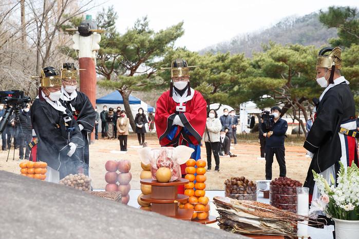 경북 구미시가 26일 신축년 정월대보름을 맞이해 금오산 잔디광장 금오제단에서 '시민 안녕과 코로나 극복 기원 금오대제'를 개최했다. 이날 행사는 코로나19로 인해 최소 인원 50여명이 참석한 가운데 방역수칙을 준수하면서 시민의 안녕과 102회 전국(장애인)체전 및 지역발전을 기원하는 고유제만 진행했다. 사진은 이날 초헌관을 맡은 장세용 시장(가운데)이 제를 올리는 모습. (사진제공=구미시청)