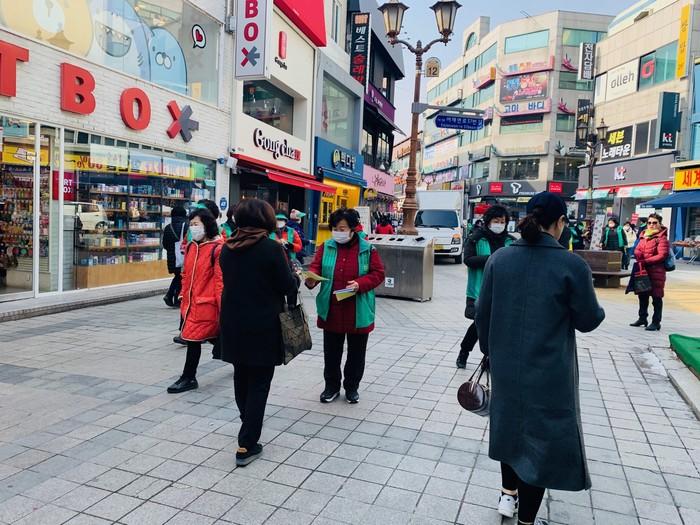 경기 이천시 창전동 새마을남녀협의회는 19일 창전동 문화의 거리 광장에서 코로나19(우한폐렴) 확산을 막기 위한 방역마스크 250장 나눔 행사를 진행했다. 사진은 시민들에게 마스크와 감염예방 행동 수칙 안내문을 나눠주고 있는 모습. (사진제공=이천시청)