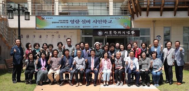 | ▲ 이승옥 강진군수(앞줄 좌측부터 일곱 번째)가 지난 1일 강진군 시문학파기념관 기획프로그램 ‘영랑 실버 시인학교’ 에 참여한 군민들과 개강식 후 기념촬영을 하고 있다. |