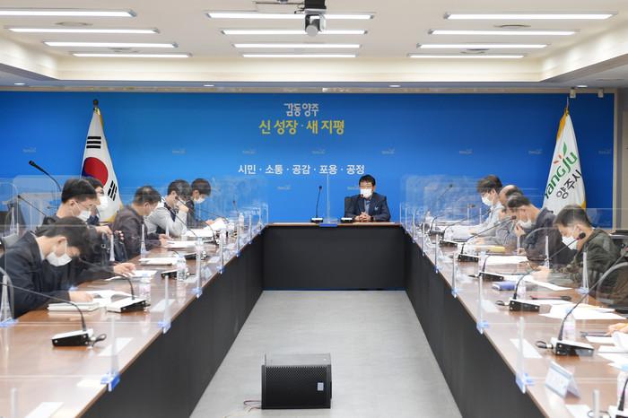 경기 양주시는 7일 시청 2층 상황실에서 경기교통공사 조기개청을 위한 실무회의를 열고 개청 준비사항 등을 집중 점검했다. 이날 회의에는 경기도와 양주시 관계 공무원, 경기교통본부 관계자, 시공사 관계자 등 12명이 참석해 경기교통공사 개청 관련 행정 협의와 중장기적 정책사업 추진계획 등을 심도있게 논의했다. 사진은 참여자들이 회의하는 모습. (사진제공=양주시청)