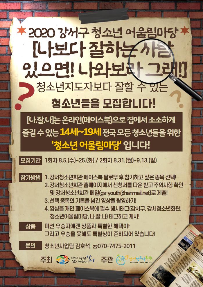 [시민일보 = 홍덕표 기자] 서울 강서구(구청장 노현송)가 코로나19 장기화로 야외활동이 어려운 청소년들을 위해 집에서 즐길 수 있는 '2020년 강서구 청소년 어울림 마당-나보다 잘하는 사람 있으면! 나와보라 그래!'를 개최한다고 18일 밝혔다.