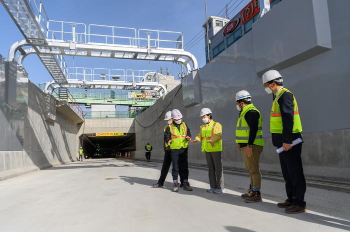 지난 16일 김수영 서울 양천구청장이 오는 4월16일 개통 예정인 신월여의지하도로(옛 제물포터널) 현장을 방문했다. 신월여의 지하도로는 신월IC~여의도 7.53km 구간을 지하도로로 연결해 교통체증를 해소할 것으로 보인다. 사진은 김 구청장(가운데)이 현장을 점검하고 있는 모습. (사진제공=양천구청)