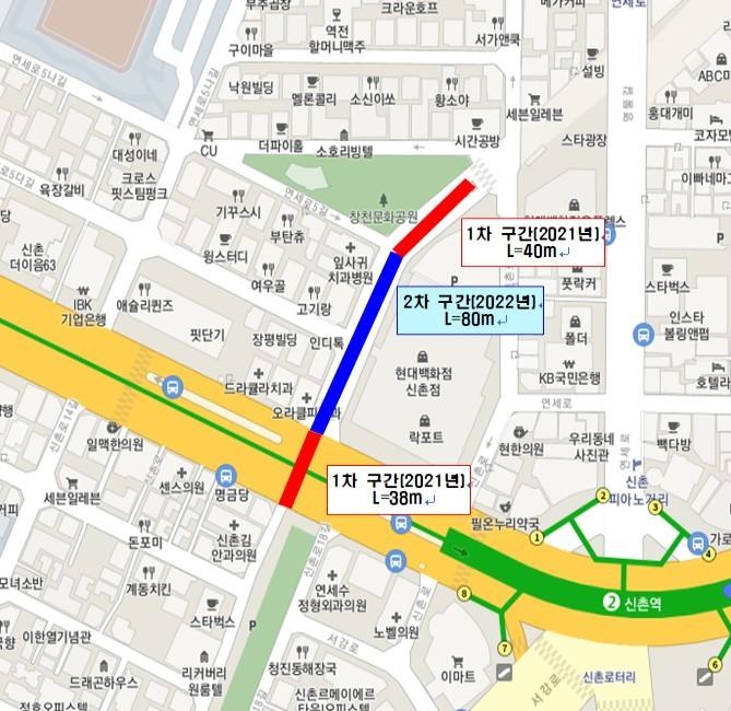17일 구에 따르면 공사 구간은 창천문화공원 앞에서 연세로5길을 따라 신촌로에 이르는 158m로, 올해 1차(78m)와 내년 2차(80m) 공사로 나눠 진행한다.