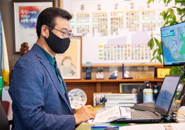 성장현 서울 용산구청장이 13일 ‘2021년 성인지·여성친화도서 이해교육’을 들었다. 이번 교육은 성별 영향을 고려한 정책 수립을 목표로 13~14일 비대면 형태로 진행되며 구청 전직원이 교육 대상이다. 사진은 성 구청장이 온라인으로 교육을 듣고 있는 모습. (사진제공=용산구청)