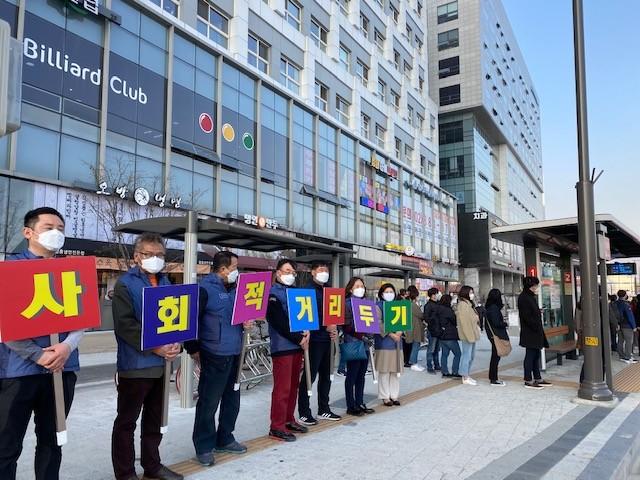경기 하남시 풍산동 주민자치위원회가 코로나19 확산 방지를 위해 6일 유동인구가 많은 센텀비즈 지식정보산업센터 앞 버스정류장에서 '사회적 거리두기' 동참 캠페인을 펼쳤다. 사진은 위원들이 피켓을 들고 사회적 거리두기를 홍보하는 모습. (사진제공=하남시청)