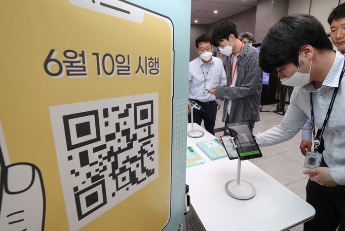 정부가 코로나19 확산 방지를 위해 오는 10일부터 감염병 고위험시설에 대해 QR코드 기반의 전자출입명부(Ki-Pass)를 의무 도입하기로 한 가운데 2일 오후 세종시 정부세종청사 보건복지부에서 시범운영을 하고 있다.