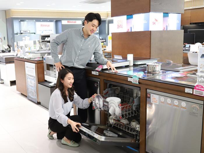 ▲ 롯데하이마트 메가스토어 잠실점에서 모델들이 식기세척기를 살펴보고 있다. (사진제공=롯데하이마트) |