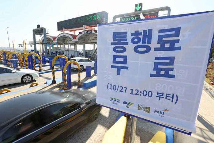 27일 무료통행을 개시한 경기도 김포시 일산대교 톨게이트 앞에 통행료 무료 관련 현수막이 걸려 있다.