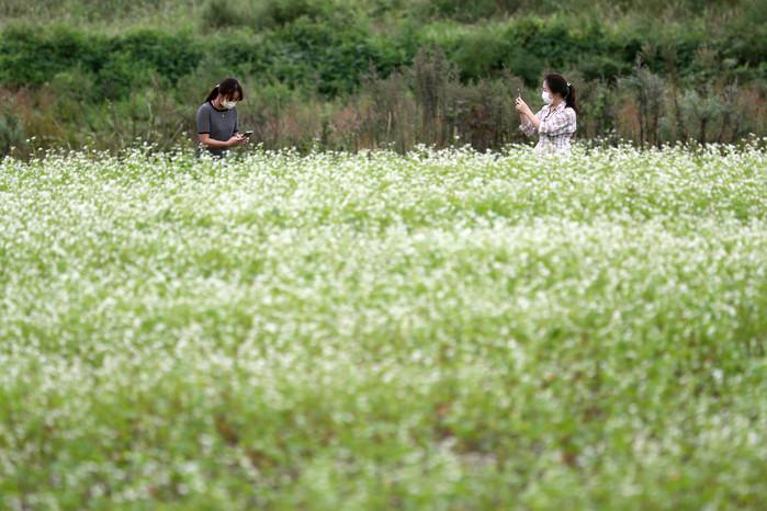 인천 옹진군 백령면 진촌6리 메밀밭에 메밀꽃이 만개했다. 사진은 메밀밭을 지나가던 마을 주민들이 만개한 메밀밭을 배경으로 사진촬영을 하고 있는 모습. (사진제공=옹진군청)