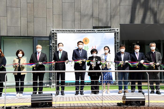 오승록 서울 노원구청장은 15일 예룸예술학교와 발달장애인평생교육센터 개관식에 참석했다. 구는 (옛)덕성여대 생활관을 리모델링해 지하 1층·지상 1층은 발달장애인평생교육센터로, 지상 2~3층은 예룸예술학교가 이용하도록 했다. 사진은 오 구청장(가운데)이 관계자들과 테이프 커팅을 하는 모습. (사진제공=노원구청)