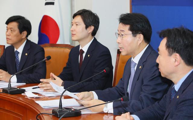 더불어민주당 조정식 정책위의장이 8일 국회에서 4·15 총선 청년교육분야 공약을 발표하고 있다. 오른쪽부터 윤관석 정책위수석부의장, 조정식, 김해영, 조승래 의원.