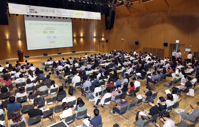 20일 서울시청 다목적홀에서 열린 2019 서울 자살예방 국제 심포지엄에서 김호 서울대학교 보건대학원 원장이 기조강연을 하고 있다.