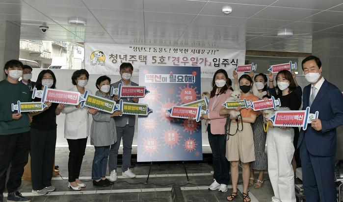 서울 서대문구가 최근 북가좌동에 위치한 반려견 친화형 청년주택 5호 ‘견우일가(犬友一家)’ 입주식을 열었다. 만 19~37세의 청년 12명이 입주할 수 있고, 반려견은 소형견(7kg 이하)이면 입주 가능하고, 가구당 2마리까지 된다. 사진은 입주식에서 문석진 구청장(오른쪽)이 입주청년들과 ‘백신이 필요해!’ 퍼포먼스를 하고 있는 모습. (사진제공=서대문구청)