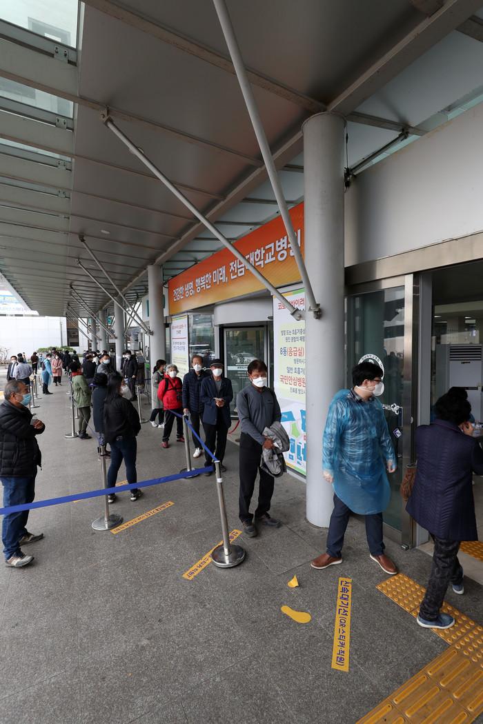 18일 오전 광주 동구 학동 전남대학교병원 본관(1동)에서 처방전을 받으려는 방문객이 차례를 기다리고 있다. 전남대병원은 의료진과 환자, 입주업체 직원 사이에서 잇따라 코로나19 확진자가 발생하자 본관을 폐쇄하고 진료를 중단했다.
