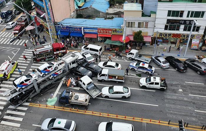20일 오전 8시56분께 전남 여수시 광무동 한재사거리에서 승용차 탁송 차량과 승용차 여러대가 충돌해 119 구조대원들이 현장을 정리하고 있다. 이 사고로 횡단보도를 건너던 행인 등 12명이 중경상을 입어 치료를 받고 있다.