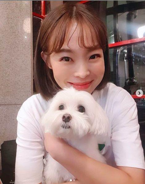 사진 속 오나미가 절친인 개그맨 박성광의 반려견인 광복이와 함께 포즈를 취하고 있는 모습이 담겨있다.