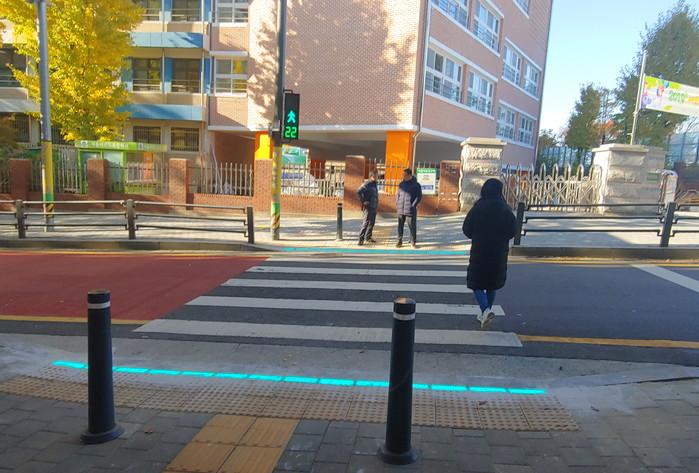 바닥 신호등은 횡단보도 길이와 동일하게 양쪽 인도 끝자락에 4m 길이로 설치됐으며, 신호 제어기와 연결돼 보행 신호와 동일하게 색이 변하는 보조 신호등 역할을 한다.
