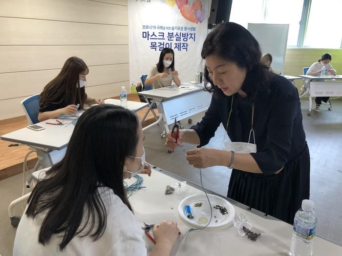 서울 강동구 자원봉사자들이 15일 취약계층 아동들의 코로나19 예방을 위해 마스크 분실방지 목걸이 제작 봉사활동을 진행했다. 사진은 자원봉사자들이 마스크 분실방지 목걸이를 만들고 있는 모습. (사진제공=강동구청)