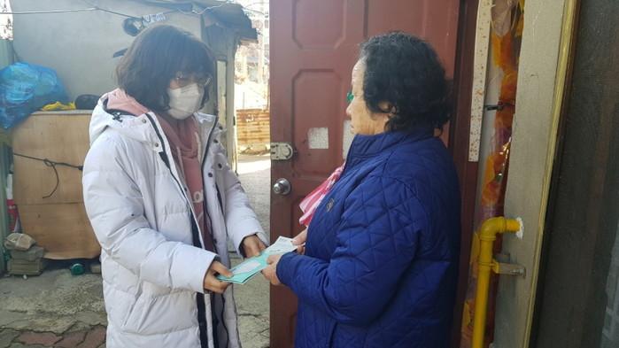 경기 연천군 신서면 행정복지센터는 코로나19 확산 예방을 위해 지역내 기초생활수급자, 차상위계층, 장애인 등의 안전 취약계층 270여명과 노인 일자리 사업 참여자 74명에게 약 1650개의 마스크를 전달했다. 사진은 노인에게 마스크를 전달하는 모습. (사진제공=연천군청)