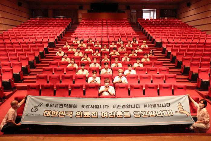 경기 하남문화재단은 코로나19의 종식을 위해 노력하는 의료진에게 존경의 뜻을 전하기 위해 ‘덕분에 챌린지’ 캠페인에 동참했다. 사진은 덕분에 챌린지 포즈를 취하고 하트 모양으로 앉아 의료진과 방역인원에 대한 감사와 응원을 전하고 있는 재단 임직원들의 모습.(사진제공=하남문화재단)