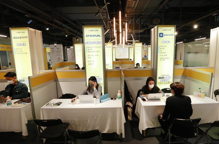 서울 강남구는 구직자들과 유망 스타트업의 인재 채용을 지원하기 위해 최근 이틀간 ‘2021 강남구 스타트업 채용 페스티벌’을 개최했다. 사전 신청자 대상으로 현장에서 인재채용 및 채용상담이 이뤄졌으며, 유튜브를 통해 생중계로 진행된 화상면접도 큰 호응을 얻었다. 사진은 현장에서 상담이 진행되고 있는 모습. (사진제공=강남구청)