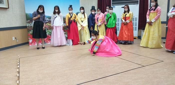전남 곡성군은 지난 22일 베트남·캄보디아 다문화가족들과 함께 '2020년 찾아가는 한복문화 교육'을 운영했다. 이 교육은 한국의 고유성 회복과 함께 국내외에 한복문화를 선도하고자 진행됐다. 사진은 참가자들이 한복을 입고 전통놀이를 체험하고 있는 모습. (사진제공=곡성군청)