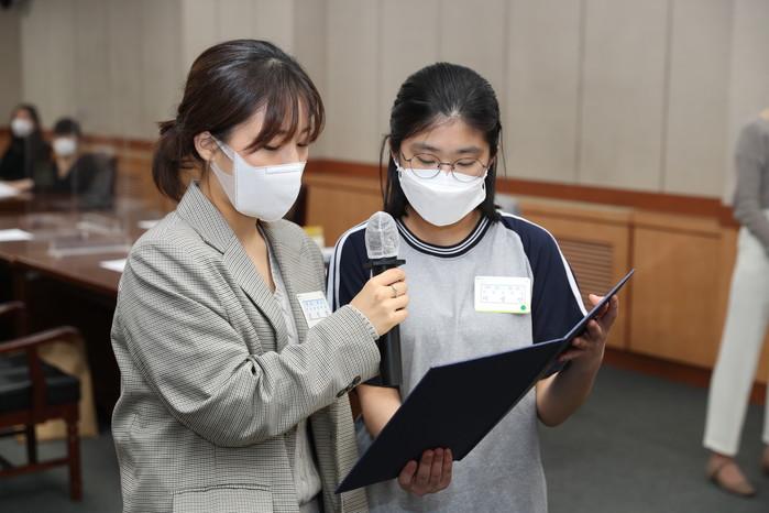 | ▲ 최근 열린 '2021 강북구 대학생 멘토링 결연식'에서 대학생 멘토와 멘티 학생이 함께 결연증서를 읽고 있는 모습. (사진제공=강북구청) |
