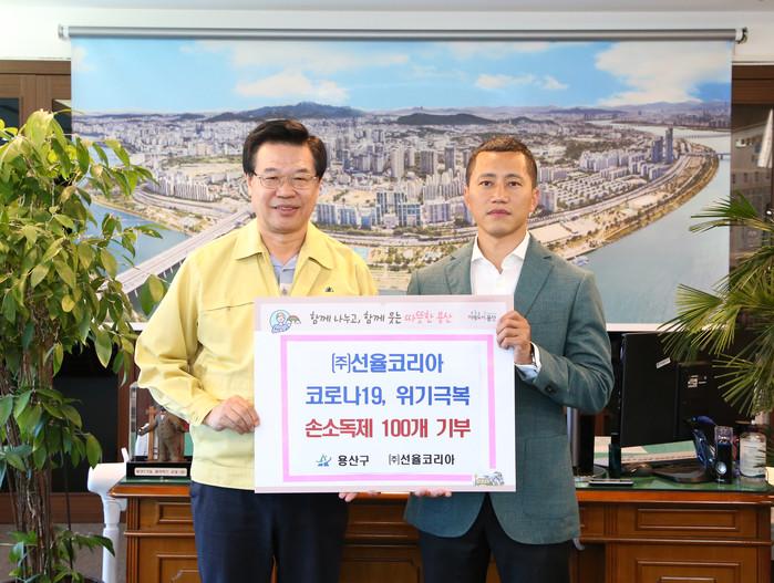 서울 용산구가 1일 (주)선율코리아로부터 코로나19 극복을 위한 손 소독제 100개를 전달 받았다. 이날 전달 받은 소독제는 지역내 어린이집 등에 전달될 예정이다. 사진은 성장현 구청장(왼쪽)이 성원철 대표로부터 물품을 전달 받고 기념촬영을 하는 모습. (사진제공=용산구청)