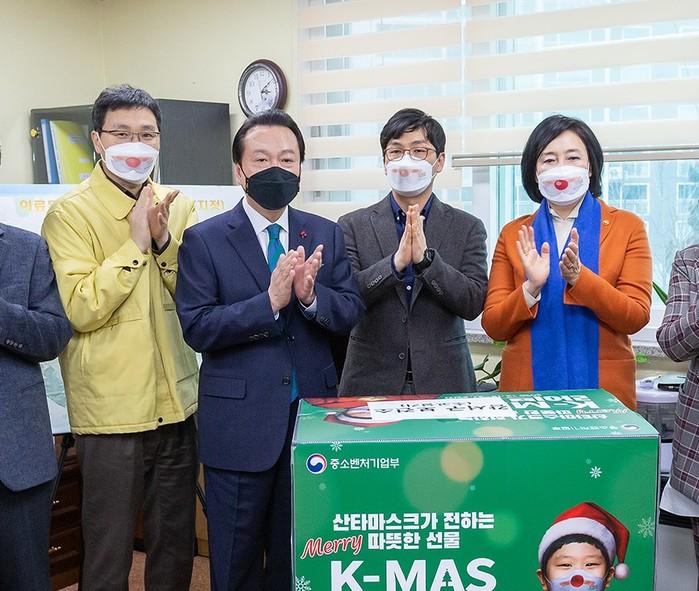 서울 강서구는 23일 선별진료소가 마련된 강서구보건소에서 중소벤처기업부 노동조합으로부터 산타마스크·초콜릿 등으로 구성된 코로나19 격려용품을 전달받았다. 사진은 전달식에서 (왼쪽에서 두 번째부터)노현송 구청장, 김영환 중기부 노조위원장, 박영선 중기부 장관이 기념촬영을 하는 모습. (사진제공=강서구청)