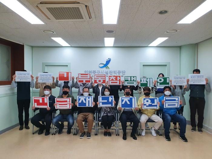 인천 중구 시설관리공단은 12일 코로나19 사태로 어려워진 고용 유지와 일자리 창출을 위해 정부 긴급재난지원금 기부 캠페인에 동참, 캠페인의 취지 및 절차에 대해 적극 홍보하고 있다. 사진은 임직원들이 캠페인 홍보를 하며 기념촬영을 하는 모습. (사진제공=인천중구시설관리공단)