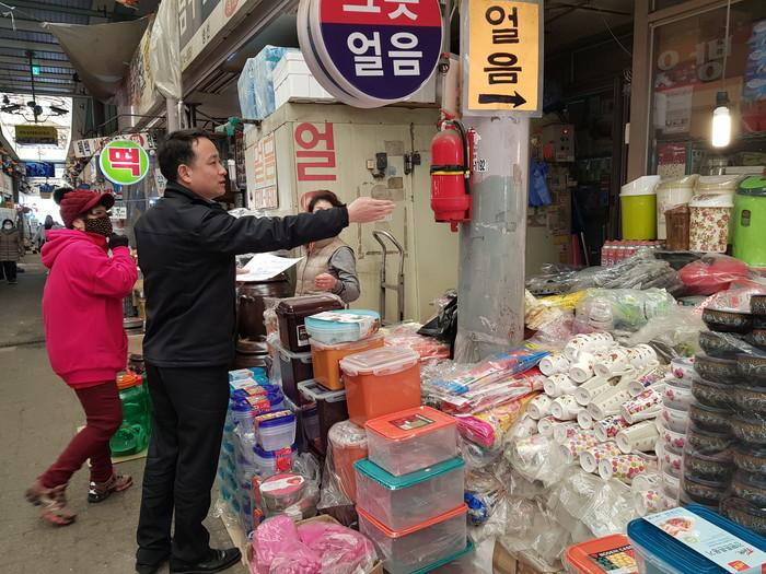 인천 미추홀소방서는 최근 겨울철 소방안전대책의 일환으로 지역내 화재경계지구 중 석바위 시장에 방문해 상인들에게 보이는 소화기 안내문을 배포하고 시장내 설치된 보이는 소화기를 점검했다. 사진은 소방서 관계자가 보이는 소화기를 점검하는 모습. (사진제공=미추홀소방서)