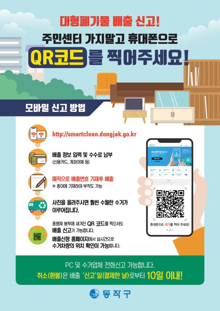 대형폐기물 스마트 배출시스템은 배출자가 QR코드 접속 후 배출부터 결제까지 전과정을 비대면으로 처리해 신청절차를 간소화했고 대행업체는 알림 확인 후 폐기물을 수거해 구민들의 편익에 도움을 줄 것으로 예상된다.