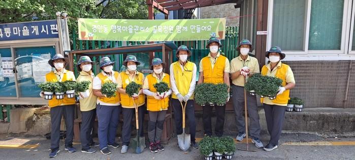 경기 광주시 경안동 행복마을관리소는 최근 추석 명절을 앞두고 골목 화단에 국화를 식재하는 아름다운 골목정원 조성과 깨끗한 거리 환경정화 활동을 진행했다. 사진은 관리소 종사자들이 국화 식재 기념촬영을 하는 모습. (사진제공=광주시청)